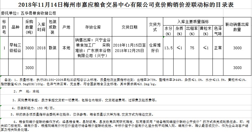 受客戶委托,梅州市嘉應(yīng)糧食交易中心有限公司定于2018年11月14日(星期三)舉辦稻谷購銷價(jià)差聯(lián)動(dòng)標(biāo)的交易會(huì),五華縣糧食收儲(chǔ)公司擬銷售和采購早秈稻3000噸。
