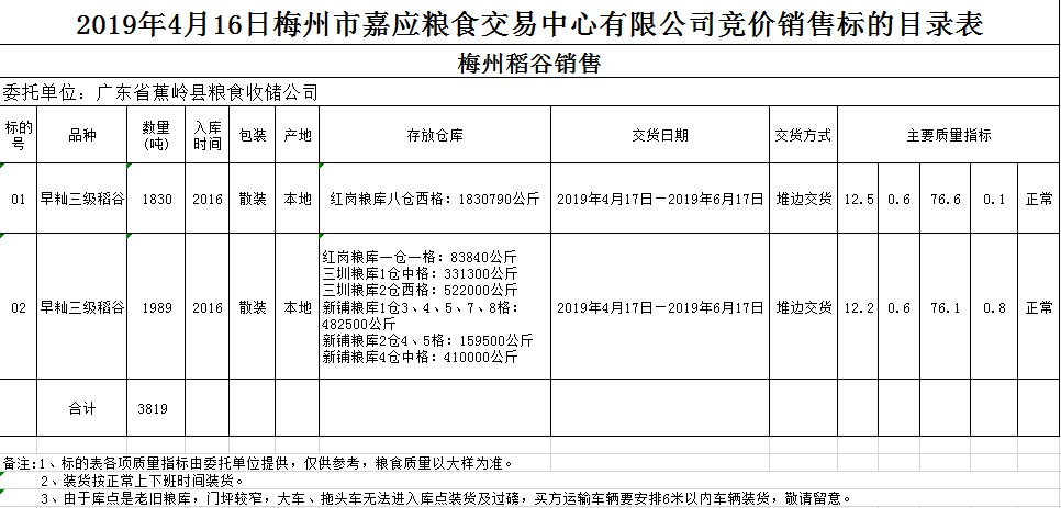 受客戶委托,梅州市嘉應糧食交易中心有限公司定于2019年4月16日(星期二)舉辦糧食競價交易會,廣東省蕉嶺縣糧食收儲公司擬銷售2016年早秈稻3819噸。