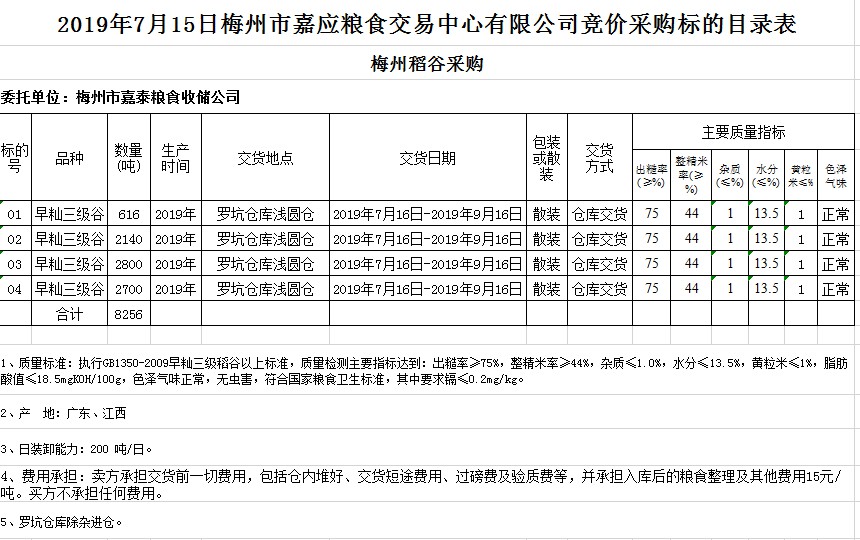 受客戶委托,梅州市嘉應(yīng)糧食交易中心有限公司定于2019年7月15日(星期一)舉辦糧食競價交易會,梅州市嘉泰糧食收儲公司擬采購2019年早秈稻8256噸。