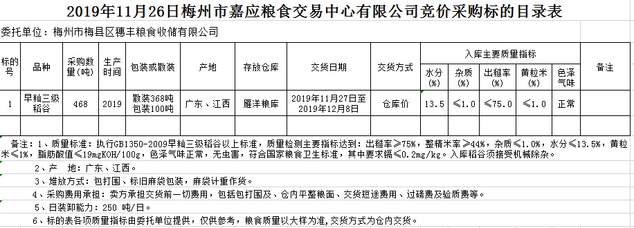 受客戶委托,梅州市嘉應(yīng)糧食交易中心有限公司定于2019年11月26日(星期二)舉辦糧食競價(jià)交易會,梅州市梅縣區(qū)穗豐糧食收儲有限公司擬采購2019年早秈稻468噸。
