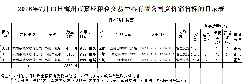 受客戶委托,梅州市嘉應(yīng)糧食交易中心有限公司定于2016年7月13日舉辦糧食競價(jià)交易會(huì),大埔縣糧食收儲(chǔ)公司擬銷售2013年早秈稻谷3283.6噸。