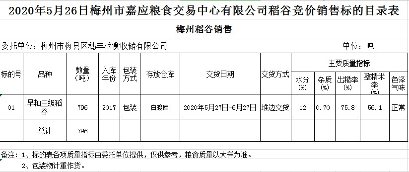 交易時(shí)間和地點(diǎn):2020年5月26日(星期二)上午10時(shí)。廣東省梅州市彬芳大道南161號梅州市糧食交易中心3樓。