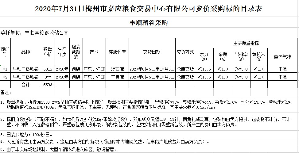 受客戶委托,梅州市嘉應(yīng)糧食交易中心有限公司定于2020年7月31日(星期五)舉辦糧食競(jìng)價(jià)交易會(huì),豐順縣糧食收儲(chǔ)公司擬采購(gòu)2020年早秈稻6693噸。