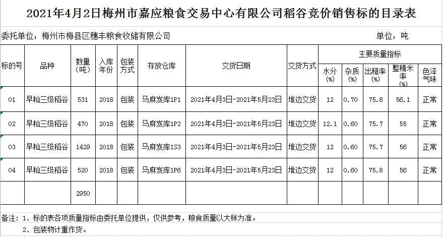 受客戶委托,梅州市嘉應(yīng)糧食交易中心有限公司定于2021年4月2日(星期五)舉辦糧食競價(jià)交易會。梅州市梅縣區(qū)穗豐糧食收儲有限公司擬銷售2018年早秈稻2950噸。