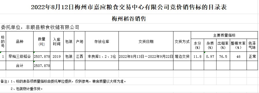 受客戶委托,梅州市嘉應糧食交易中心有限公司定于2022年8月12日(星期五)舉辦糧食競價交易會。豐順縣糧食收儲有限公司擬銷售2019年早秈稻2507.878噸。