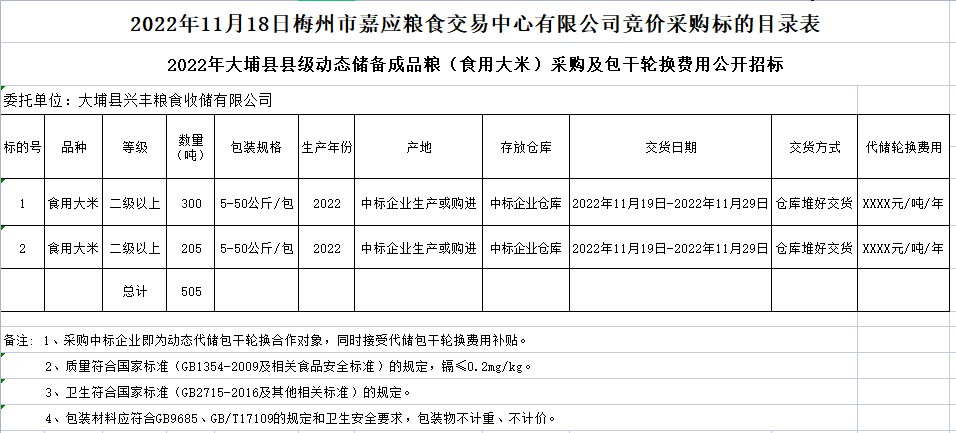 受客戶委托,梅州市嘉應糧食交易中心有限公司定于2022年11月18日(星期五)上午10時10分在廣東省梅州市彬芳大道南161號梅州市糧食交易中心3樓,舉辦大埔縣縣級動態(tài)儲備成品糧(食用大米)采購公開招標。