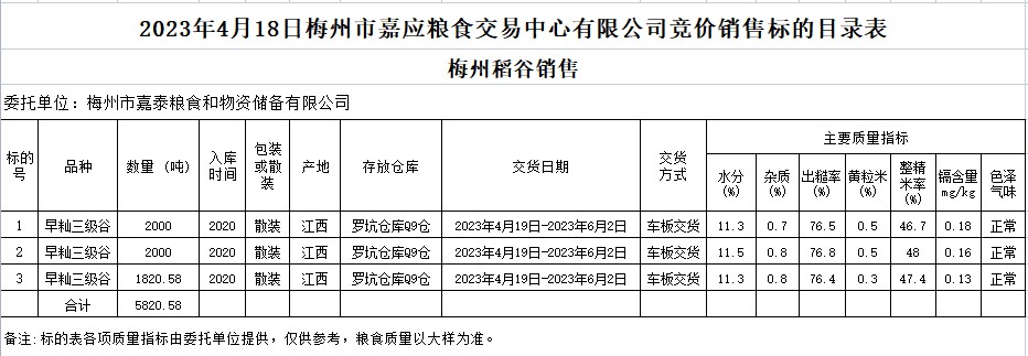 受客戶委托,梅州市嘉應(yīng)糧食交易中心有限公司定于2023年4月18日(星期二)舉辦糧食競(jìng)價(jià)交易會(huì)。梅州市嘉泰糧食和物資儲(chǔ)備有限公司擬銷售2020年早秈稻5820.58噸。