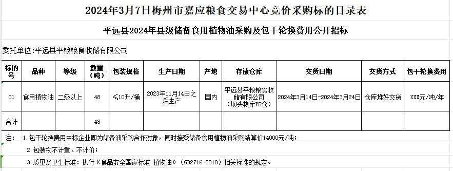 受平遠(yuǎn)縣平糧糧食收儲(chǔ)有限公司委托,梅州市嘉應(yīng)糧食交易中心有限公司定于2024年3月7日(星期四)上午10時(shí)舉辦平遠(yuǎn)縣2024年縣級(jí)儲(chǔ)備食用植物油采購(gòu)及包干輪換費(fèi)用公開(kāi)招標(biāo)。