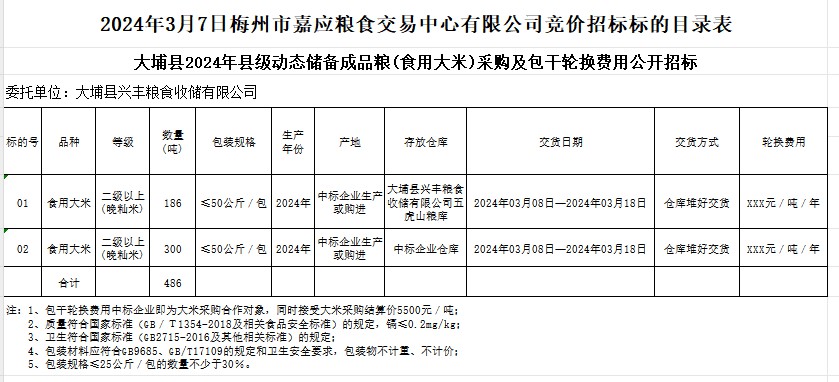 大埔縣2024年縣級動態(tài)儲備成品糧(食用大米)采購及包干輪換費用公開招標公告
