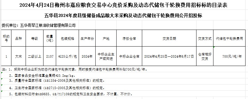 五華縣2024年度縣級儲備成品糧大米采購及動態(tài)代儲包干輪換費(fèi)用公開招標(biāo)公告