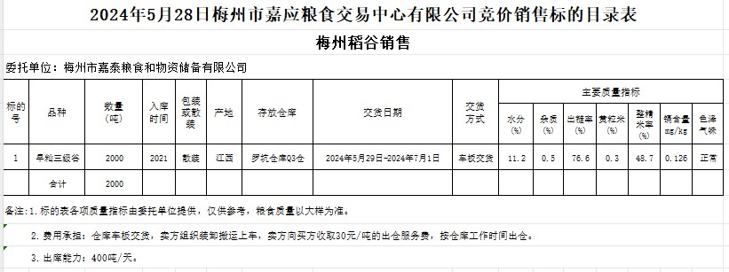 受客戶委托,梅州市嘉應(yīng)糧食交易中心有限公司定于2024年5月28日(星期二)舉辦糧食競價(jià)交易會(huì)。梅州市嘉泰糧食和物資儲(chǔ)備有限公司擬銷售2021年產(chǎn)早秈稻2000噸。