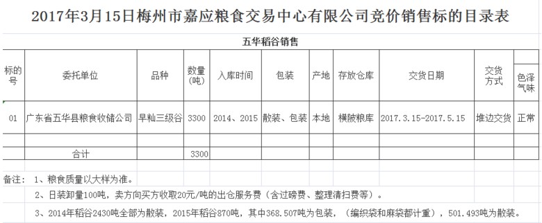 受客戶委托,梅州市嘉應(yīng)糧食交易中心有限公司定于2017年3月15日舉辦糧食競價(jià)交易會(huì),廣東省五華縣糧食收儲(chǔ)公司擬銷售早秈三級(jí)稻谷3300噸。