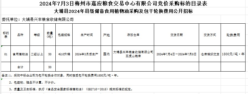 大埔縣2024年縣級(jí)儲(chǔ)備食用植物油采購及包干輪換費(fèi)用公開招標(biāo)公告