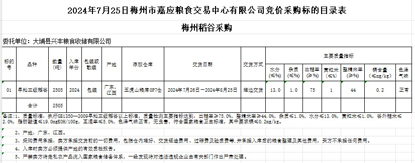 受客戶委托,梅州市嘉應(yīng)糧食交易中心有限公司定于2024年7月25日(星期四)舉辦糧食競價交易會。大埔縣興豐糧食收儲有限公司擬采購2024年產(chǎn)早秈稻谷2505噸。