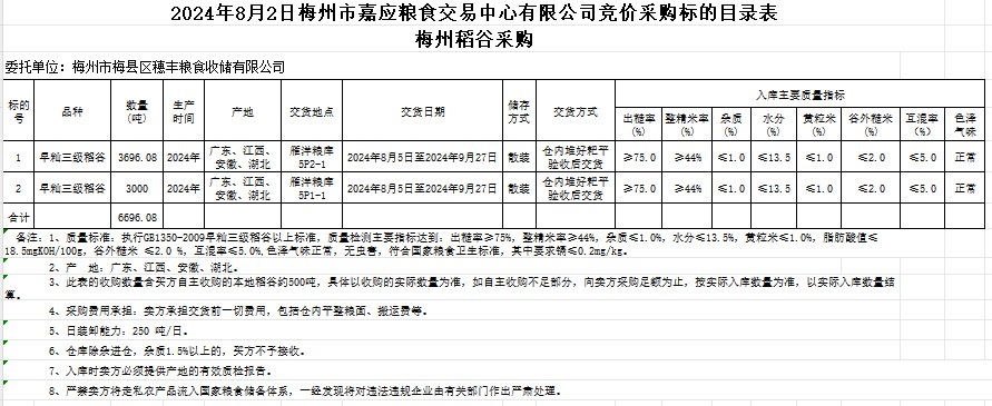 受客戶委托,梅州市嘉應(yīng)糧食交易中心有限公司定于2024年8月2日(星期五)舉辦糧食競(jìng)價(jià)交易會(huì)。梅州市梅縣區(qū)穗豐糧食收儲(chǔ)有限公司擬采購(gòu)2024年產(chǎn)早秈稻6696.08噸。