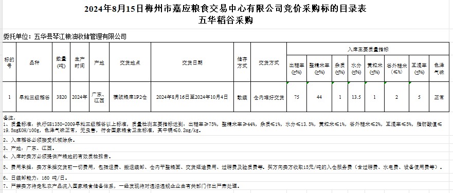 受客戶委托,梅州市嘉應(yīng)糧食交易中心有限公司定于2024年8月15日(星期四)舉辦糧食競價(jià)交易會(huì)。五華縣琴江糧油收儲(chǔ)管理有限公司擬采購2024年產(chǎn)早秈稻谷3820噸。