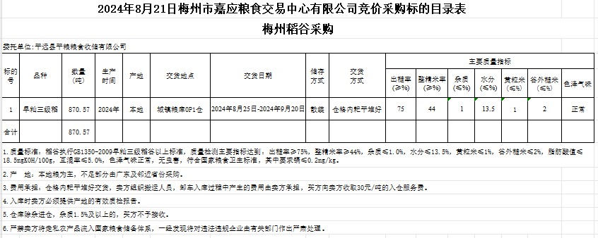 受客戶委托,梅州市嘉應糧食交易中心有限公司定于2024年8月21日(星期三)舉辦糧食競價交易會。平遠縣平糧糧食收儲有限公司擬采購2024年產早秈稻870.57噸。