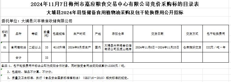 大埔縣2024年縣級儲備食用植物油采購及包干輪換費用公開招標公告
