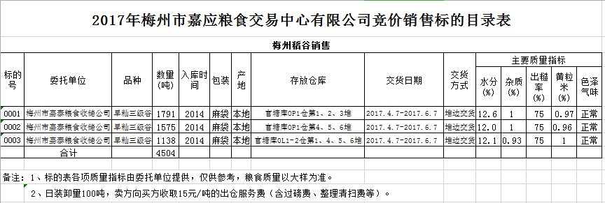 受客戶委托,梅州市嘉應(yīng)糧食交易中心有限公司定于2017年4月7日舉辦糧食競價交易會,梅州市嘉泰糧食收儲公司擬銷售早秈三級稻谷4504噸。