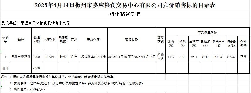 受客戶委托,梅州市嘉應(yīng)糧食交易中心有限公司定于2025年4月14日(星期一)舉辦糧食競(jìng)價(jià)交易會(huì)。平遠(yuǎn)縣平糧糧食收儲(chǔ)有限公司擬銷售2022年產(chǎn)早秈稻谷2000噸。