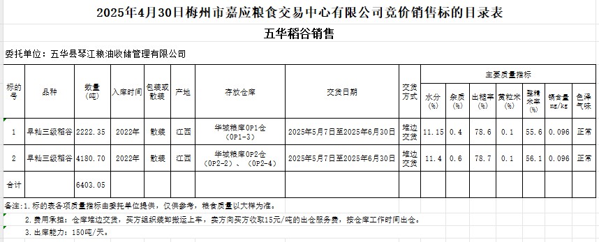 受客戶(hù)委托,梅州市嘉應(yīng)糧食交易中心有限公司定于2025年4月30日(星期三)舉辦糧食競(jìng)價(jià)交易會(huì)。五華縣琴江糧油收儲(chǔ)管理有限公司擬銷(xiāo)售2022年產(chǎn)早秈稻谷6403.05噸。