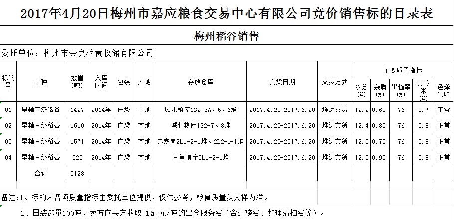 受客戶委托,梅州市嘉應(yīng)糧食交易中心有限公司定于2017年4月20日舉辦糧食競價(jià)交易會,梅州市金良糧食收儲有限公司擬銷售2014年早秈三級稻谷5128噸。