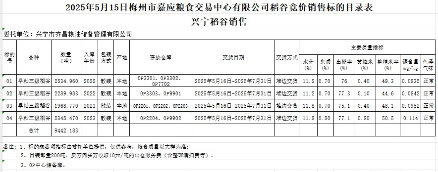 受客戶委托,梅州市嘉應(yīng)糧食交易中心有限公司定于2025年5月15日(星期四)舉辦糧食競價(jià)交易會(huì)。興寧市齊昌糧油儲(chǔ)備管理有限公司擬銷售2022年、2023年產(chǎn)早秈稻谷9442.183噸。