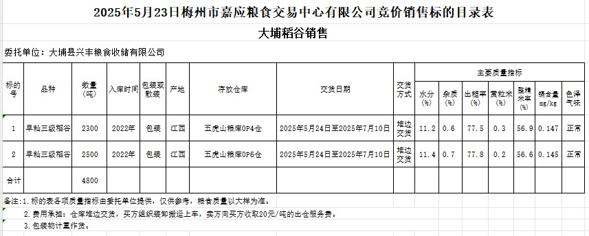 受客戶委托,梅州市嘉應糧食交易中心有限公司定于2025年5月23日(星期五)舉辦糧食競價交易會。大埔縣興豐糧食收儲有限公司擬銷售2022年產(chǎn)早秈稻谷4800噸。