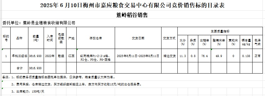 受客戶(hù)委托,梅州市嘉應(yīng)糧食交易中心有限公司定于2025年6月10日(星期二)舉辦糧食競(jìng)價(jià)交易會(huì)。蕉嶺縣金穗糧食收儲(chǔ)有限公司擬銷(xiāo)售2022年產(chǎn)早秈稻谷3616.930噸。