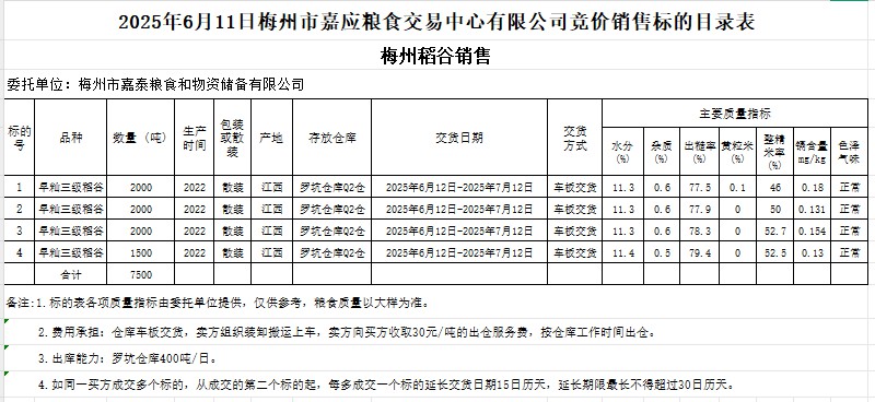 受客戶委托,梅州市嘉應糧食交易中心有限公司定于2025年6月11日(星期三)舉辦糧食競價交易會。梅州市嘉泰糧食和物資儲備有限公司擬銷售2022年產早秈稻谷7500噸。