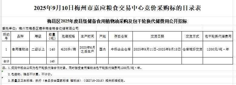 梅縣區(qū)2025年度縣級(jí)儲(chǔ)備食用植物油采購(gòu)及包干輪換代儲(chǔ)費(fèi)用公開招標(biāo)公告