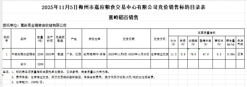 受客戶委托,梅州市嘉應糧食交易中心有限公司定于2025年11月5日(星期三)舉辦糧食競價交易會。蕉嶺縣金穗糧食收儲有限公司擬銷售2023年產中晚秈稻谷2200噸。