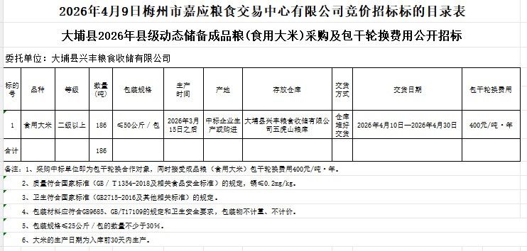 大埔縣2026年縣級(jí)動(dòng)態(tài)儲(chǔ)備成品糧(食用大米)采購(gòu)及包干輪換費(fèi)用公開(kāi)招標(biāo)公告