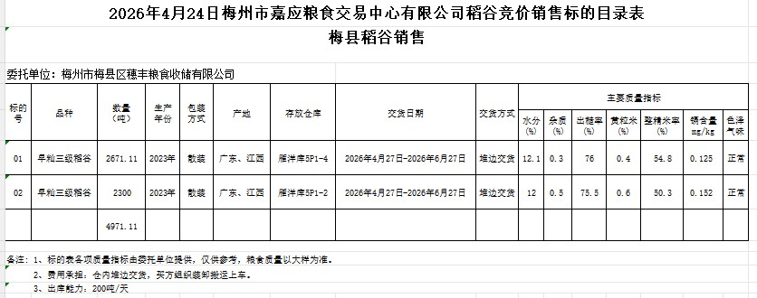 受客戶委托,梅州市嘉應(yīng)糧食交易中心有限公司定于2026年4月24日(星期五)舉辦糧食競價(jià)交易會。梅州市梅縣區(qū)穗豐糧食收儲有限公司擬銷售2023年產(chǎn)早秈稻谷4971.11噸。