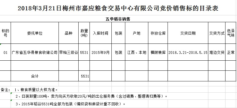 交易時(shí)間和地點(diǎn):2018年3月21日(星期三)上午10時(shí)。廣東省梅州市彬芳大道南161號梅州市糧食交易中心3樓。