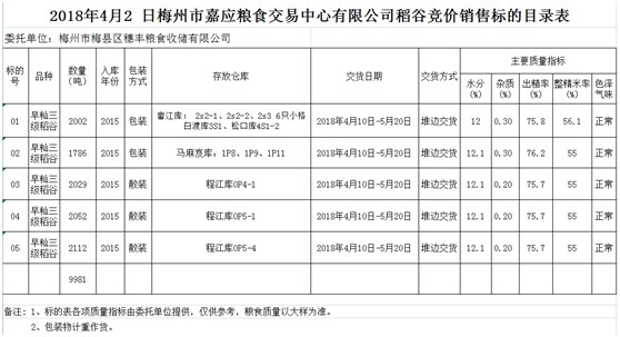 受客戶委托,梅州市嘉應(yīng)糧食交易中心有限公司定于2018年4月9日(星期一)舉辦糧食競(jìng)價(jià)交易會(huì),梅州市梅縣區(qū)穗豐糧食收儲(chǔ)有限公司擬銷售早秈稻9981噸。