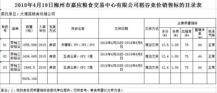 受客戶委托,梅州市嘉應(yīng)糧食交易中心有限公司定于2018年4月19日(星期四)舉辦糧食競價(jià)交易會(huì),大埔縣糧食收儲(chǔ)公司擬銷售早秈稻5928.164噸。