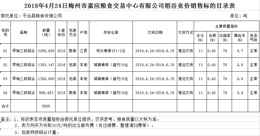 交易時(shí)間和地點(diǎn):2018年4月24日(星期二)上午10時(shí)。廣東省梅州市彬芳大道南161號梅州市糧食交易中心3樓。