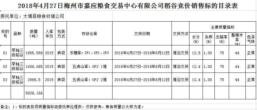 受客戶委托,梅州市嘉應糧食交易中心有限公司定于2018年4月27日(星期五)舉辦糧食競價交易會,大埔縣糧食收儲公司擬銷售早秈稻5928.164噸。