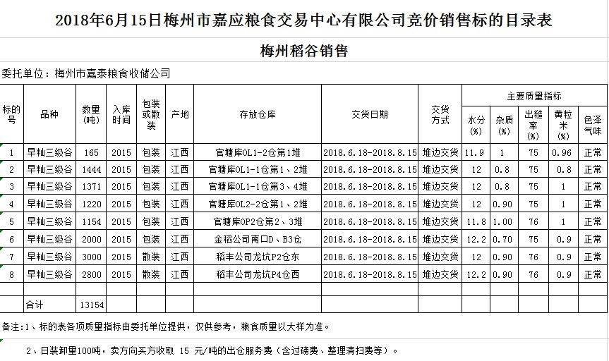 受客戶(hù)委托,梅州市嘉應(yīng)糧食交易中心有限公司定于2018年6月15日(星期五)舉辦糧食競(jìng)價(jià)交易會(huì),梅州市嘉泰糧食收儲(chǔ)公司擬銷(xiāo)售早秈稻13154噸。