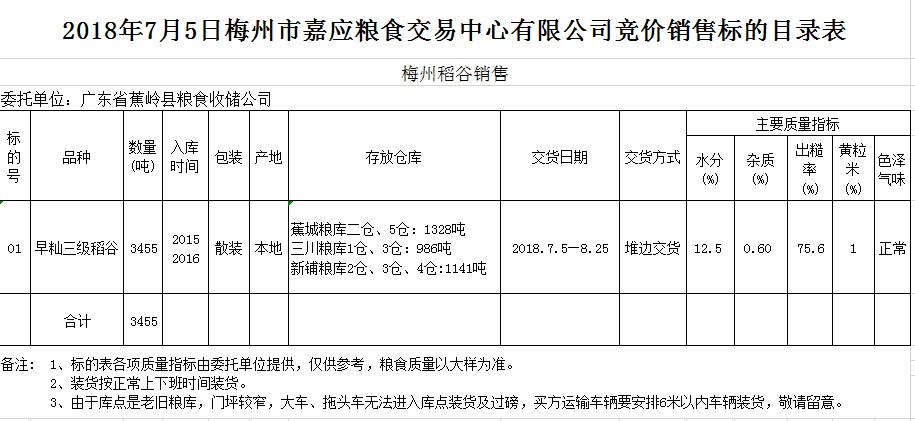 受客戶委托,梅州市嘉應(yīng)糧食交易中心有限公司定于2018年7月5日(星期四)舉辦糧食競價交易會,廣東省蕉嶺縣糧食收儲公司擬銷售早秈稻3455噸。